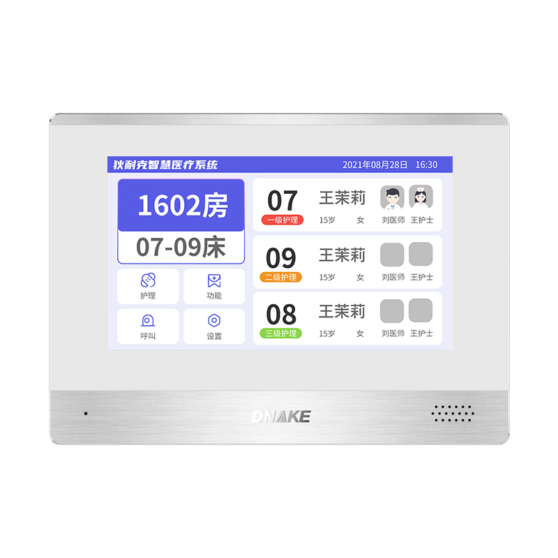 設(shè)置在病房門口的終端設(shè)備,主要用于顯示病房相關(guān)信息,內(nèi)置簡(jiǎn)易醫(yī)護(hù)工作站,支持病房床位一覽、患者動(dòng)態(tài)跟蹤、呼叫對(duì)講、增援求救等多種呼叫類型,信息齊全,及時(shí)響應(yīng)醫(yī)護(hù)需求,實(shí)現(xiàn)智能化醫(yī)護(hù)管理。